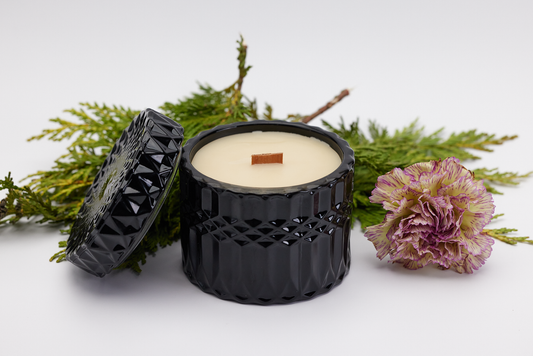 Carnation + Cedar - 7oz Vintage Etched Glass (Black) Beeswax Candle