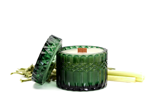 Green Tea + Lemongrass - 7oz Vintage Etched Glass (Emerald) Beeswax Candle